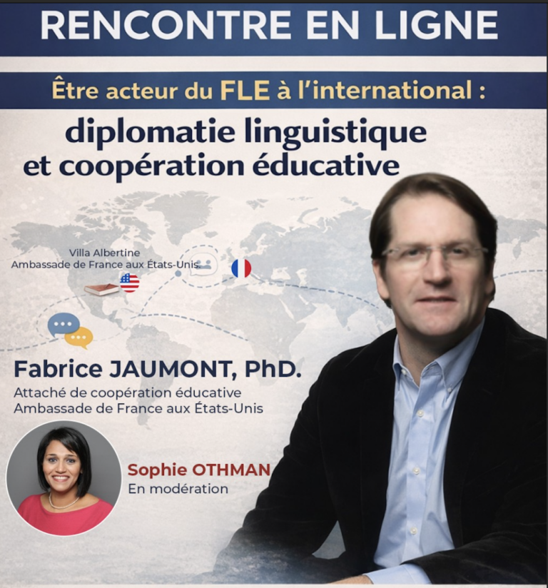 Dans le cadre du Master FLE du CLA, j’ai eu le plaisir d’inviter M. Fabrice Jaumont, attaché de coopération éducative à l’Ambassade de France aux États-Unis, à intervenir autour des enjeux du FLE à l’international, de la diplomatie linguistique et de la coopération éducative.